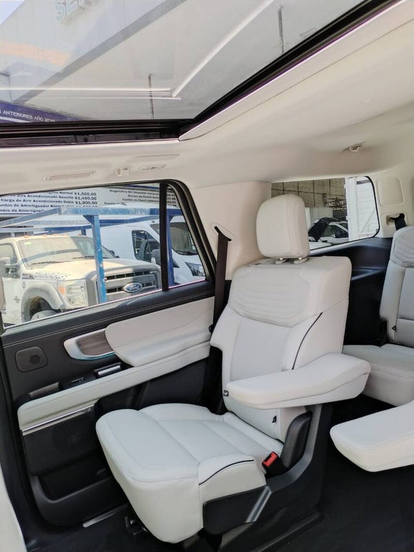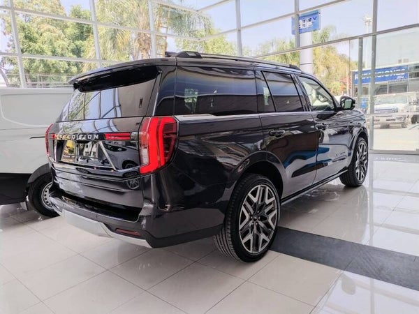 El modelo Expedition® Platinum® 2025 4x4 de tres filas les ofrece más a ti y a tu familia en cada paso. Estilo impactante: defensas superiores del color de la carrocería con una defensa inferior Silver, escalones laterales eléctricos que se extienden y retraen automáticamente pintados en Black Onyx y faros traseros exclusivos. Comodidad lujosa: asientos tapizados en cuero en la primera y segunda filas. La tecnología impresionante, que incluye Digital Experience de Ford inmersiva y totalmente nueva, se muestra en una pantalla personalizable panorámica de 24” y pantalla táctil de 13.2” en la consola central.